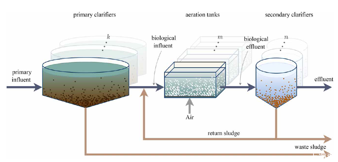 圖2、具有單個(gè)曝氣池的一般交替ASP圖,其中k,m,m值因工廠而異,具體取決于廢水進(jìn)水特性。