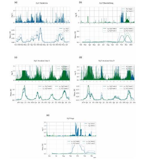 圖4、時(shí)間序列圖,用于比較a)弗雷德里西亞、(b)斯坎德堡污水處理廠、(c)阿韋德勒生物處理線、(d)阿韋德爾生物處理線3和(e)科格的N2O移動平均值和移動標(biāo)準(zhǔn)差。圖(a)所示的Fredericia案例,工藝特征每年都不同,并且有一種模式表明,N2O產(chǎn)量在冬季和春季在1-4月左右最高。斯坎德堡污水處理廠的N2O產(chǎn)量在11月和12月達(dá)到頂峰,而弗雷德里西亞的情況則不同。在圖(c)和(d)中,給出了Aved?re生物處理線1和3的N2O測量值。與弗雷德里西亞的數(shù)據(jù)類似,N2O具有多年來重復(fù)的季節(jié)性模式。Aved?re的N2O測量值在春末和夏季最高,在4月至6月左右達(dá)到峰值。K?ge污水處理廠的N2O剖面如圖(e)所示。K?ge污水處理廠的濃度在9月至10月左右達(dá)到頂峰,