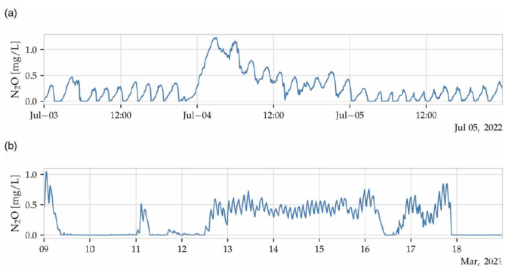 圖1、N2O濃度在(a)3天(Aved?re污水處理廠)和(b)10天(Fredericia污水處理廠)任意期間的變化示例。