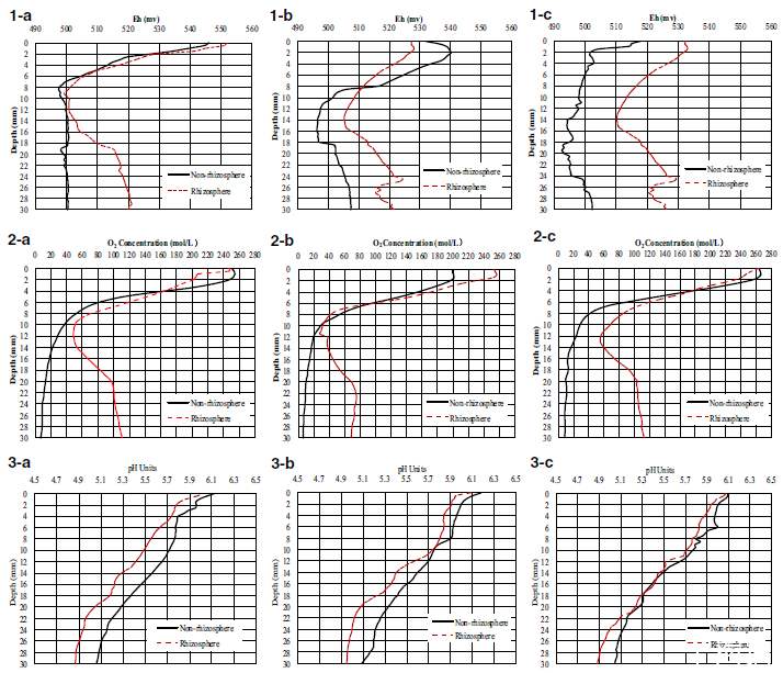 圖5、根際與非根際土壤的Eh、pH和O?剖面分布。1-a、2-a、3-a:無Fe(II)和NOR;1-b、2-b、3-b:無Fe(II)+50 mg·kg?1NOR;1-c、2-c、3-c:70 mg·kg?1Fe(II)+50 mg·kg?1NOR。Eh(氧化還原電位):根際土壤Eh顯著高于非根際,F(xiàn)e(II)添加進一步擴大差異。O?濃度:根際O?因根系泌氧而升高,NOR單獨處理會降低根際O?。pH:根際pH低于非根際,源于根系分泌有機酸和H?。