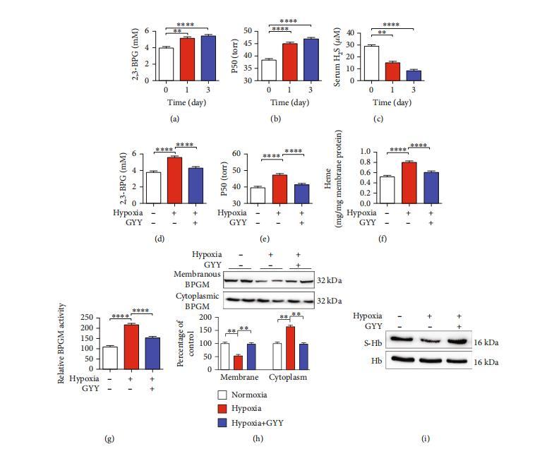 降低循環(huán)硫化氫水平有助于增加缺氧性腦損傷小鼠紅細(xì)胞中的2,3-BPG和P50水平。與先前的缺氧結(jié)果一致。研究顯示,小鼠在缺氧條件下,紅細(xì)胞2,3-BPG水平在一天內(nèi)升高,并在缺氧持續(xù)3天期間保持高水平(圖8(a))。此外,P50在缺氧一天后增加約15%,并在缺氧第三天繼續(xù)上升(圖8(b))。我們還檢測了小鼠在缺氧刺激下循環(huán)系統(tǒng)中硫化氫的水平。如圖8(c)所示,缺氧期間循環(huán)系統(tǒng)中的硫化氫水平在第一天顯著降低,并在第三天進(jìn)一步減少。紅細(xì)胞、肝臟和腎臟中的CSE表達(dá)水平在缺氧期間也顯著降低。有趣的是,GYY4137處理逆轉(zhuǎn)了缺氧引起的紅細(xì)胞2,3-BPG和P50水平升高(圖8(d)和8(e))。隨后,我們測試了缺氧對紅細(xì)胞膜Hb含量、胞質(zhì)BPGM活性以及BPGM從膜到胞質(zhì)轉(zhuǎn)運(yùn)的影響,以及缺氧期間硫化氫干預(yù)的效果。如預(yù)期,與正常氧環(huán)境下的小鼠相比,缺氧暴露組小鼠的紅細(xì)胞中血紅素含量顯著升高(圖8(f))。與此一致的是,缺氧組小鼠紅細(xì)胞的胞質(zhì)BPGM活性顯著增強(qiáng)(圖8(g)),而膜BPGM水平顯著降低,胞質(zhì)BPGM水平則顯著升高(圖8(h))。在缺氧條件下,GYY4137處理可降低紅細(xì)胞膜血紅素含量,同時(shí)提升胞質(zhì)BPGM活性和膜BPGM水平,降低胞質(zhì)BPGM水平(圖8(f)–8(h))。此外,缺氧組小鼠的血紅蛋白硫水合水平降低,而GYY4137處理可逆轉(zhuǎn)這一現(xiàn)象(圖8(i))。