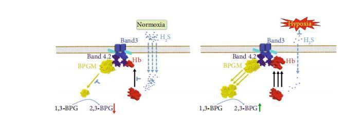 圖9:硫化氫在常氧和缺氧條件下調(diào)節(jié)2,3-BPG和Hb-O2結(jié)合親和力的潛在機(jī)制整合方案。硫化氫抑制Hb從細(xì)胞質(zhì)向膜的轉(zhuǎn)運(yùn),進(jìn)而促進(jìn)BPGM錨定于膜上,從而防止常氧條件下2,3-BPG水平的升高。在缺氧期間,硫化氫水平的降低促進(jìn)了Hb錨定于膜上,并促使BPGM從膜上釋放到細(xì)胞質(zhì)中,最終導(dǎo)致紅細(xì)胞中2,3-BPG生成的增加。