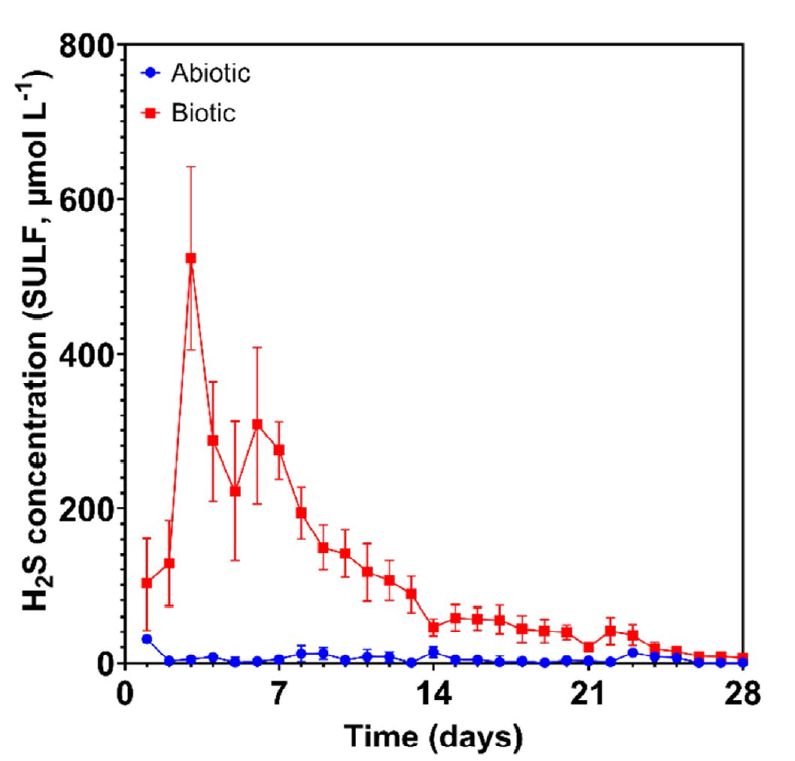 圖1、28天內(nèi)非生物和生物條件下的溶液中硫化物濃度的測量(SULF,μmol L)(原位測量了腐蝕性UNS G10180碳鋼附近的厭氧MB介質(zhì))。