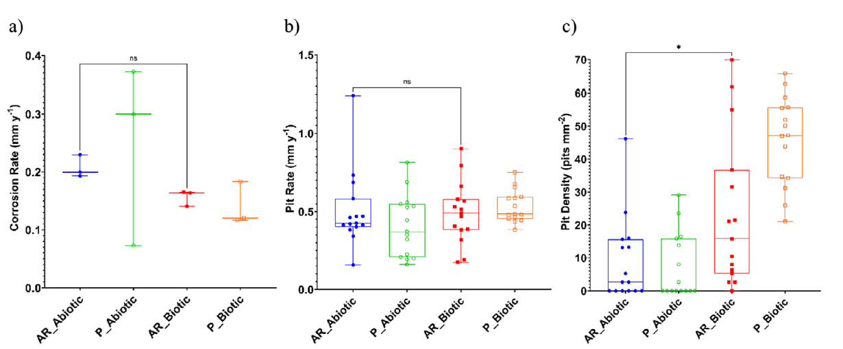 圖 3、暴露于厭氧 MB 介質(zhì) 28 天后的非生物和生物腐蝕性能:(a) 通過重量分析和表面輪廓測量評估的腐蝕速率 (b) 凹坑率和 (c) 凹坑密度(非生物和生物 AR 試樣的 p < 0.05,非生物和生物 P 試樣的 p < 0.0001,生物 AR 和生物 P 試樣的 p < 0.0066),AR 和 P 試樣。