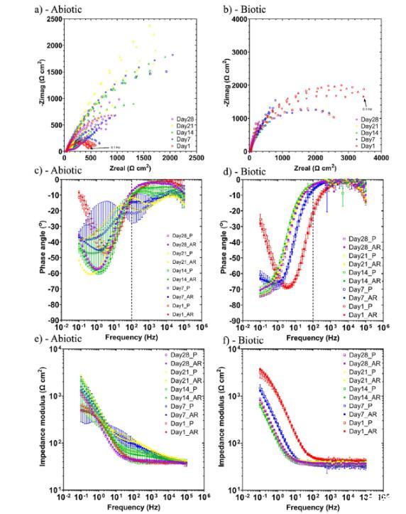 圖5、OCP厭氧MB介質(zhì)中UNS G10180碳鋼的EIS數(shù)據(jù):(a,b)奈奎斯特,(c,d)波特相位角(θvs.f)和(e,f)波特阻抗模量(|Z|與f)超過28天。(n=3)。反應(yīng)器攪拌器轉(zhuǎn)速為50 rpm。