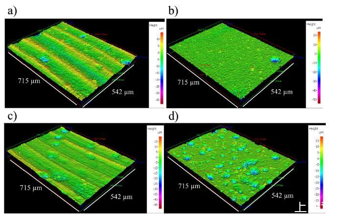 圖2、第28天清潔的UNS G10180表面的三維光學(xué)表面輪廓測量。AR優(yōu)惠券適用于:(a)非生物條件和(b)生物條件;和P試樣適用于:(c)非生物條件和(d)生物條件,暴露于厭氧MB培養(yǎng)基28天后。