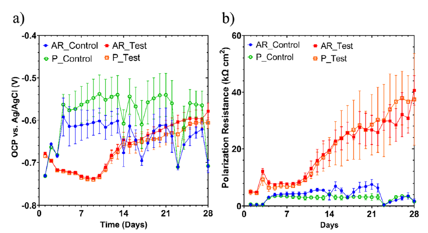 圖4、UNS G10180碳鋼的LPR數(shù)據(jù):(a)厭氧MB介質(zhì)(非生物和生物條件)中的開路電位和(b)極化電阻,對于AR和P試樣(數(shù)據(jù)點(diǎn)代表平均值±標(biāo)準(zhǔn)差,n=3)。反應(yīng)器攪拌器轉(zhuǎn)速為50 rpm。
