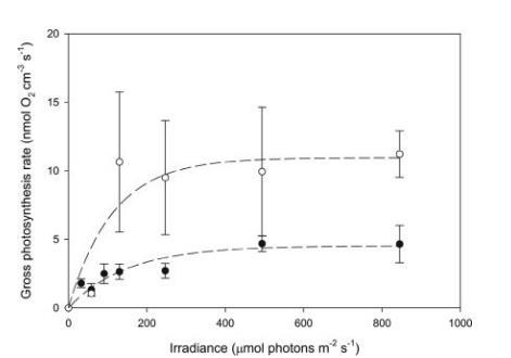 有趣的是,健康組織在暗適應(yīng)RLCs的整個輻照度范圍內(nèi)表現(xiàn)出略低的rETR值,褐帶組織也是如此,并且這反映在總光合作用輻照度曲線中。盡管RLCs的定量參數(shù)沒有顯著差異,但值得注意的是,不同技術(shù)手段均重現(xiàn)了這一趨勢。除健康組織熒光衍生的SSLC測量值外,未觀察到高輻照度下量子產(chǎn)率或O2產(chǎn)量的下降(圖5)。其他熒光衍生光曲線未出現(xiàn)顯著差異,表明觀察到的光抑制現(xiàn)象可能源于健康組織中PAR吸收率的降低,這可能導(dǎo)致更高的散射和光照暴露(圖3)。
