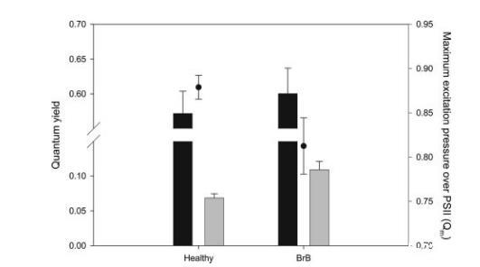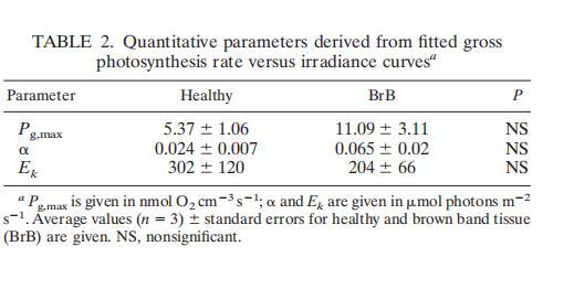 健康和褐帶組織之間的Fv/Fm沒有顯著差異,表明PSII活性沒有因纖毛蟲攝入而受到抑制。實際上,光利用效率,以有效PSII量子產(chǎn)量ΔF/Fm'為特征,顯然在與纖毛蟲關(guān)聯(lián)的蟲黃藻中增加了。