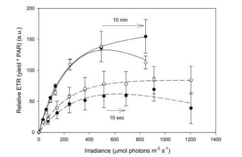 基于一種新穎的方法學(xué)方法,我們表明纖毛蟲內(nèi)的蟲黃藻具有光合能力。雖然氧氣和可變?nèi)~綠素a熒光的微電極先前已分別用于研究蟲黃藻在宿主內(nèi)光合作用的異質(zhì)性,但本研究首次提供了PSII量子產(chǎn)量和衍生的rETR測量值與穩(wěn)態(tài)O2濃度、O2通量速率以及患病珊瑚組織中的總光合作用的聯(lián)合測量。我們對從患病珊瑚獲得的RLCs和SSLCs的比較也是新穎的。我們的結(jié)果表明,SSLCs不同于RLCs,后者在每個輻照度水平之間僅延遲10至20秒。很明顯,如果蟲黃藻被允許在每個輻照度水平適應(yīng)延長一段時間,它們的光合性能會產(chǎn)生更高的rETR值。因此,使用PAM儀器獲得的熒光衍生光曲線取決于先前的光照暴露。
