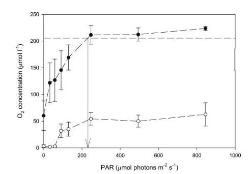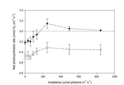 在組織表面測得的O?動態(tài)變化呈現(xiàn)出典型模式:隨著光照強度增加,健康組織的O?濃度先升后飽和,最終漸近趨近最大值(圖6)。通過這些曲線可估算補償光照強度Ec,即組織表面與周圍水體間雙層屏障(DBL)不存在氧氣梯度的光照強度。在此光照強度下,氧氣消耗與生成達到平衡,無凈交換;當(dāng)光照強度超過Ec時,系統(tǒng)從凈異養(yǎng)狀態(tài)轉(zhuǎn)變?yōu)樽责B(yǎng)狀態(tài)。健康組織的這一轉(zhuǎn)變發(fā)生在更高光照強度(230 mol光子/m2/s)下,高于先前報道的珊瑚數(shù)據(jù),這反映出珊瑚具有高光適應(yīng)性(Acropora muricata的枝條生長于礁坪區(qū)域),因而呼吸速率較高。相比之下,褐帶組織表面的O?濃度顯著降低,由于纖毛蟲等成分的高呼吸作用,即使在最高光照強度下,其O?濃度也僅達到周圍水體的25%。在黑暗環(huán)境和最低光照條件下,褐帶組織表面幾乎呈現(xiàn)無氧狀態(tài),表明氧氣供應(yīng)存在跨DBL的擴散限制(圖6)。