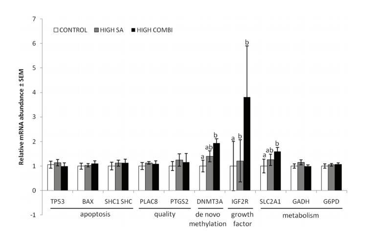 我們接下來研究了囊胚中與凋亡、發育、質量和代謝相關的關鍵基因表達。出乎意料的是,許多這些基因的表達模式在由HIGH SA成熟卵母細胞產生的胚胎與對照組之間無差異。然而,這些數據表明DNA甲基化和葡萄糖轉運的調控存在差異;與對照組相比,來自HIGH COMBI條件下成熟卵母細胞的囊胚中DNMT3A和SLC2A1均上調。與對照組相比,在HIGH SA或HIGH COMBI條件下成熟的任一組中,IGF2R基因表達均上調。