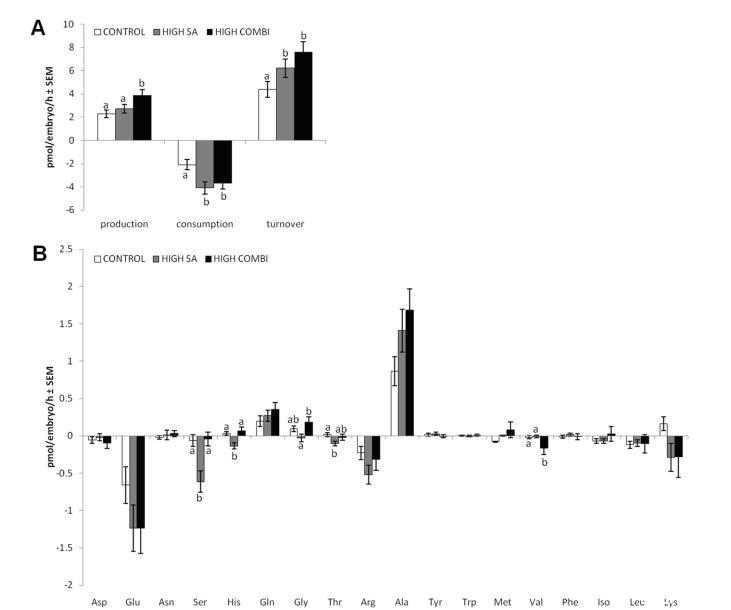 如圖2A所示,與對照胚胎相比,來自在所有三種NEFA存在下成熟卵母細胞的囊胚顯示氨基酸消耗、產生和總周轉顯著升高。與對照胚胎相比,HIGH SA胚胎顯示氨基酸消耗和周轉顯著更高。