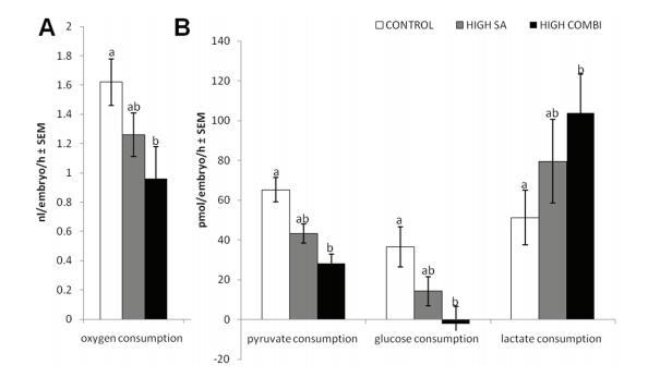 鑒于暴露卵母細胞于升高NEFA影響囊胚質量、基因表達模式和氨基酸代謝的觀察,我們接下來研究了這些胚胎的氧氣消耗。使用非侵入性實時氧氣消耗測定,我們發現來自HIGH COMBI條件下成熟卵母細胞的囊胚消耗的氧氣顯著少于對照胚胎。HIGH SA組與對照組之間或HIGH SA與HIGH COMBI胚胎之間氧氣消耗無顯著差異。我們還測定了來自NEFA存在下成熟卵母細胞的囊胚對丙酮酸、葡萄糖和乳酸的消耗。與對照胚胎相比,HIGH COMBI胚胎消耗的丙酮酸和葡萄糖顯著較少。相比之下,HIGH COMBI胚胎消耗的乳酸顯著多于對照組。HIGH SA與對照胚胎之間丙酮酸、葡萄糖或乳酸消耗水平無顯著差異。卡方檢驗顯示處理組間發育階段無顯著差異。因此,發育階段可排除為可能的混淆因素。