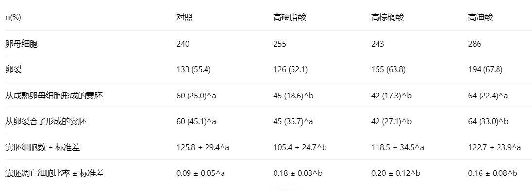 在成熟培養基中補充不同NEFA組合對卵裂率無顯著影響,但基于比值比,在升高硬脂酸(HIGH SA)或補充升高硬脂酸(SA)、棕櫚酸(PA)和油酸(OA)濃度組合(HIGH COMBI)的培養基中成熟卵母細胞導致受精后第7天達到囊胚階段的卵母細胞數量顯著減少。HIGH COMBI處理還減少了形成囊胚的卵裂合子數量,與對照組相比。與對照組相比,HIGH SA組中卵裂合子成為囊胚的傾向較低。HIGH SA和HIGH COMBI暴露during maturation對發育能力的影響數據見表1。