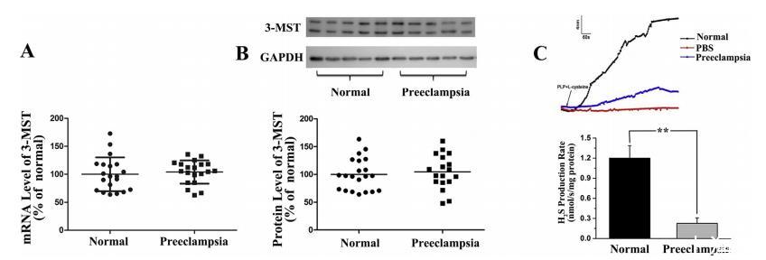 我們之前的研究顯示,先兆子癇胎盤中CBS和CSE的蛋白水平顯著低于健康胎盤。一致地,免疫組化顯示,先兆子癇胎盤中CBS和CSE的免疫染色水平低于正常血壓胎盤(圖1A&D,B&F)。我們然后測定了先兆子癇胎盤中3-MST的水平,并與正常血壓胎盤比較。如圖2A&B所示,3-MST mRNA和蛋白表達在健康和平先兆子癇胎盤之間無顯著差異。為了確認先兆子癇胎盤中H2S生產是否減少,進行了H2S生產測量。發現先兆子癇胎盤中H2S生產率顯著降低(圖2C,P<0.01 vs正常組)。