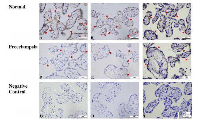 圖1. 人胎盤中CBS、CSE和3-MST的表達情況。A-F圖通過免疫細胞化學分析展示了健康胎盤與子癇前期胎盤中CBS(A&D)、CSE(B&E)和3-MST(C&F)的陽性染色代表性切片。G-I圖顯示陰性對照切片,這些切片使用與對應阻斷肽(G&H)或IgG(I)預孵育10倍過量的一抗制備。箭頭指示合體滋養層細胞的陽性染色,箭頭頭指示血管內皮細胞的陽性染色。原始放大倍數為200倍。