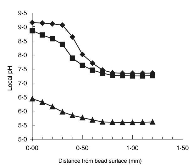 這些大變化背后的機制假定與珠內pH梯度差異相關。從圖7可見,在pH 9.00和9.25下發酵22小時的珠最外部pH梯度有顯著差異。在珠內部,局部pH似乎差異較小。盡管在高pH下發酵的珠中pH梯度更陡,但在高pH下發酵的珠中心局部pH僅比在pH 6.5下發酵的珠高1.7單位。