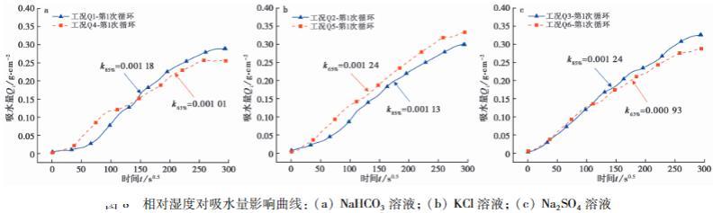 工況Q1和Q2分別使用8%質(zhì)量分數(shù)的NaHCO3溶液和KCl溶液,對應(yīng)濃度分別為1.04 mol·L-1和1.17 mol·L-1,通過計算可得對應(yīng)電導(dǎo)率分別約為6.43 S·m-1和11.24 S·m-1。因此,雖然工況Q1和Q2的孔隙結(jié)構(gòu)和組成成分相近,但由于孔隙溶液的導(dǎo)電性差異,KCl溶液中試樣飽和區(qū)的視電阻率小于NaHCO3溶液中試樣飽和區(qū)的視電阻率。由此可得,孔隙溶液中的可溶鹽離子對多孔介質(zhì)的整體電性有著重要作用。