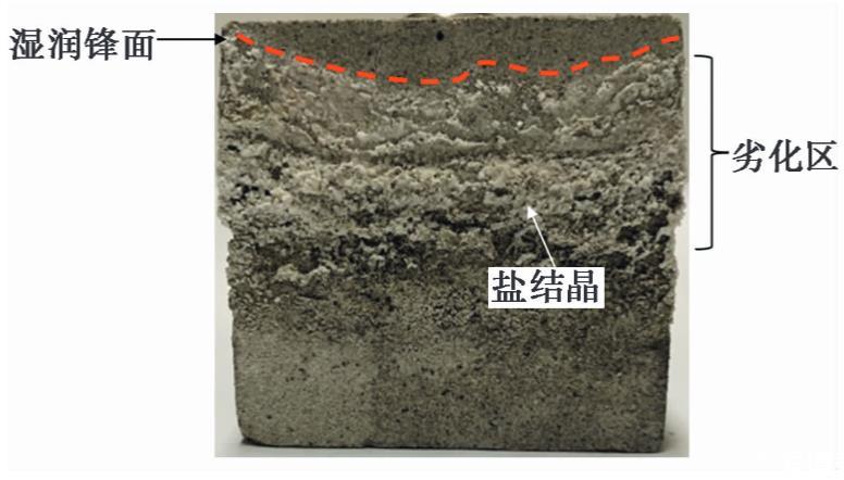 對比圖4與圖7可看出,在毛細上升3 h時,5次干濕循環(huán)后的試樣表層濕潤鋒上升高度較第1次循環(huán)增加了一倍,表明干濕循環(huán)對孔隙結(jié)構(gòu)有明顯的破壞作用,孔隙通道的擴張使毛細運移速率加快,進而在濕潤鋒區(qū)域出現(xiàn)明顯的表層鹽結(jié)晶劣化現(xiàn)象,如圖8所示。與第1次循環(huán)不同的是,內(nèi)部孔隙因反復(fù)干濕循環(huán)而增大,導(dǎo)致在第5次循環(huán)狀態(tài)下,試樣的孔隙飽和度迅速增加,最終飽和區(qū)域較第1次循環(huán)也有明顯的擴大。