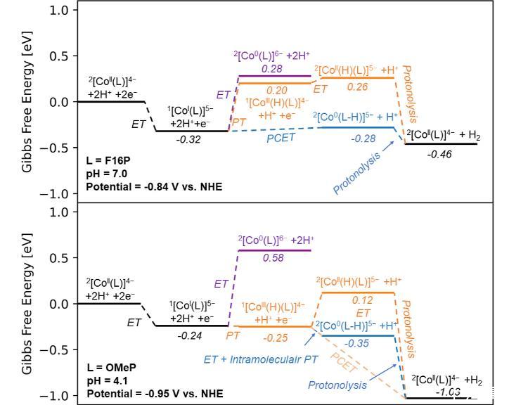 圖5、計(jì)算了[CoF16P]3–(頂部)和[CoOMeP]3–(底部)系統(tǒng)的吉布斯自由能圖。[2Co0(P)]6–符號(hào)是形式化的,實(shí)際上額外的電荷在铚和配體之間是去域化的。在2[Co(P–H)]5–記號(hào)中,P–H形式上對(duì)應(yīng)陽離子自由基卟啉配體P?+和氫化物。吉布斯自由能圖是在催化劑達(dá)到最高噸位的pH值和催化波起始電位計(jì)算的。對(duì)于電子貧乏的[Co(F16P)]3–系統(tǒng),pH為7.0,電位為?0.84 V,而對(duì)于[Co(OMeP)]3–系統(tǒng),pH為4.1,電位為?0.95,對(duì)NHE為?0.95。由于質(zhì)子和電子勢(shì)不同,H2的形成在下板比上板更為放熱。