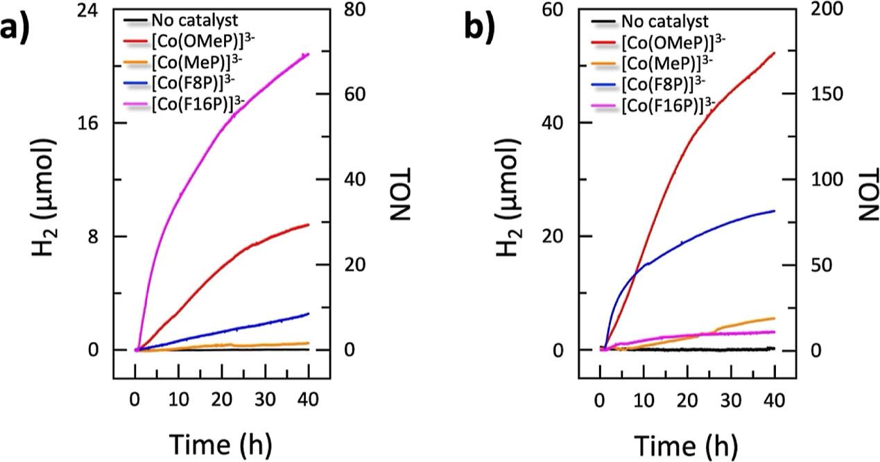 圖4、在均相水溶液中,在0.1 mM催化劑[Co(OMeP)]3–、[Co(MeP)]3–、[Co(F8P)]3–、[Co(F8P)]3或[Co(F16P)]3–)、0.5 mM[Ru(bpy)3]Cl2作為光敏劑、0.1 M抗壞血酸和TCEP作為電子供體下,使用藍(lán)光照射(450 nm)進(jìn)行的氫發(fā)生的演化,16毫瓦)。條件:T=298 K,0.1 M磷酸鹽水溶液緩沖液。