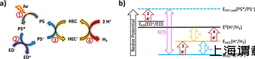 圖1、(a)簡(jiǎn)化的光催化機(jī)制,以及(b)在三組分分子光催化氫演化系統(tǒng)中,還原淬滅途徑不同氧化還原對(duì)的氧化還原勢(shì)(以V為單位)之間的關(guān)系。ED:犧牲電子供體;附言:光敏劑;HEC:氫演化催化劑;E(T):動(dòng)力學(xué)的三重激發(fā)態(tài)能量;η:催化劑的過電位;Edr:從還原光敏劑PS–到催化劑的電子轉(zhuǎn)移步驟的驅(qū)動(dòng)力(以V為單位)。