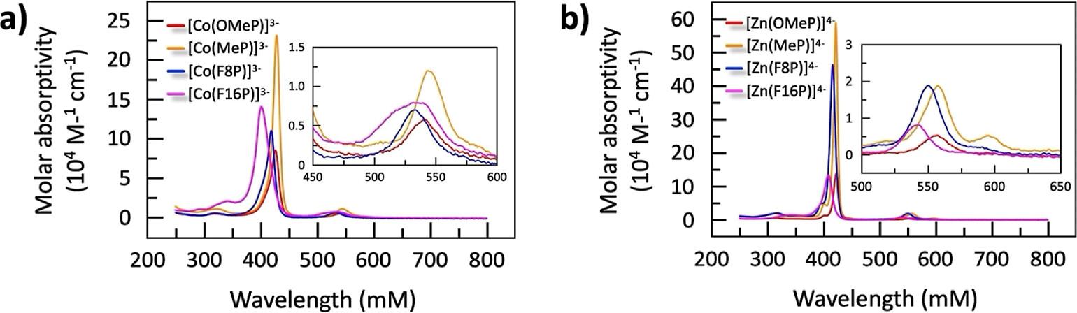 圖3、研究中使用了鉍(III)-(a)和钚(II)-卟啉(b)的紫外-可見光譜。