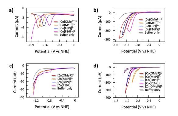 圖2、研究的水溶性金屬卟啉配合物在pH 7.0和4.1的電化學(xué)反應(yīng)。(a)pH 7.0下輔卟啉配合物的差分脈沖伏安法(DPV)和(b)循環(huán)伏安法(CV);(c)pH 7.0下鋅卟啉配合物的線性掃頻伏安法(LSV);(d)pH 4.1下輔卟啉配合物的CV。條件:pH 7.0時(shí)使用0.1 M磷酸鹽緩沖液,pH 4.1時(shí)使用1.0 M磷酸鹽緩沖液,0.07厘米2個(gè)玻璃碳工作電極,Pt線輔助電極,Ag/AgCl參考電極,CV和LSV掃描速率50 mV s–1,T=298 K。DPV實(shí)驗(yàn)參數(shù):電位增加0.004 V,振幅0.05 V,脈沖寬度0.05秒,采樣寬度為0.0167秒,采樣周期為0.5秒。