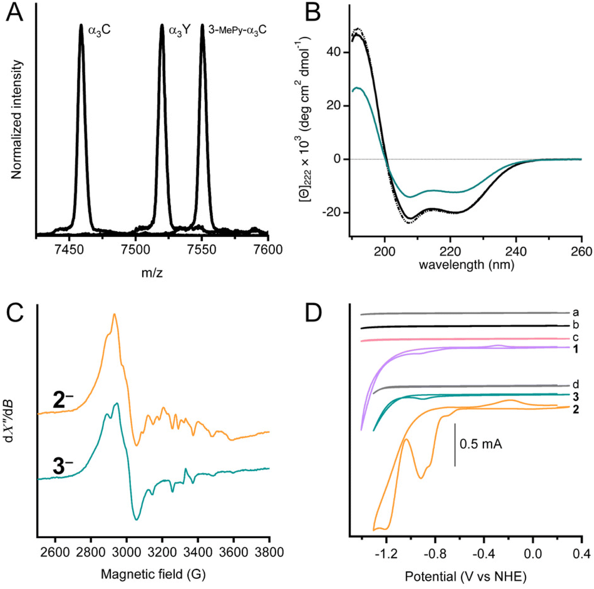 (D)堆疊的循環伏安圖,包括100 mM KP pH 7緩沖液(掃描A,灰色)、α3C蛋白膜(掃描b,黑色)、3-MePy-α3C蛋白膜(掃描c,粉色)、0.47 mM 1(掃描1,紫色)、100 mM MES、100 mM MOPS、75 mM KCl緩沖液(掃描D,灰色)、蛋白膜3(掃描3,青綠色)和1.0 mM 2蛋白膜(掃描2,橙色)。CVsa–c和CV1在100 mM KP、pH 7.0±0.1緩沖液中記錄。CVd、2和3采集于100 mM MES、100 mM MOPS pH 7.0緩沖液中。所有測量均采用250 mV s?1的掃描速率。
