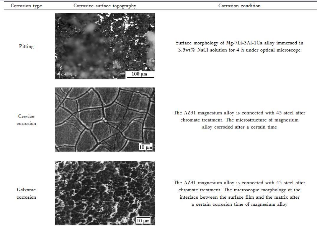 廣義的局部腐蝕包括點蝕、縫隙腐蝕、電偶腐蝕、晶間腐蝕、選擇性腐蝕、應力腐蝕和氫致腐蝕等。合金中常見的局部腐蝕類型及表面形貌如表1所示。