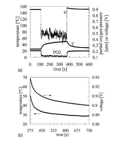 在IV極化期間,自呼吸燃料電池陰極表面上方的溫度、PO2和PH2O的微傳感器測(cè)量反映了這些量隨電流密度增加而發(fā)生的顯著變化。觀察到PO2線性下降和PH2O線性增加,這與通量平衡一致。在最大功率點(diǎn)附近RH出現(xiàn)最大值,這與PH2O線性增加和溫度隨電流密度增加呈指數(shù)增長(zhǎng)相一致。