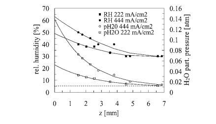 圖12顯示了在相同的電流負(fù)載循環(huán)條件(在0和333 mA/cm2之間)下測(cè)量的RH和PH2O瞬態(tài)。雖然RH信號(hào)顯示非常小的瞬態(tài)響應(yīng),但PH2O響應(yīng)在恒定電流負(fù)載下顯示出較大的變化。PH2O瞬變的初始部分可以用指數(shù)函數(shù)近似,得出時(shí)間常數(shù)TH2O~14 s。這個(gè)時(shí)間常數(shù)基本上反映了濕度傳感器的上升時(shí)間,因此初始PH2O瞬變時(shí)間尺度的精確測(cè)量未能實(shí)現(xiàn),但我們可以將其值限定在小于約14 s。隨后PH2O隨時(shí)間增加的速度要慢得多,并且是非指數(shù)性質(zhì)的。這種響應(yīng)表明陰極表面有液態(tài)水積聚,如先前所述。當(dāng)電流在t~1500 s中斷時(shí),PH2O迅速恢復(fù)到環(huán)境條件,同樣具有約14 s的弛豫時(shí)間。(然而這次請(qǐng)注意,PH2O信號(hào)沒有表現(xiàn)出次要的線性分量。)另一方面,RH響應(yīng)顯示出有趣的超調(diào)行為。最可能的是,這種超調(diào)與濕度傳感器固有響應(yīng)時(shí)間的限制有關(guān)(參見濕度傳感器校準(zhǔn)部分)。為完整起見,我們注意到,這種超調(diào)也可能是由于水生產(chǎn)立即中斷與電池溫度緩慢下降之間的時(shí)間滯后造成的。由于這種滯后,陰極上方仍然溫暖的空氣將經(jīng)歷RH的突然下降,隨著電池(和周圍空氣)冷卻下來,RH presumably會(huì)恢復(fù)。