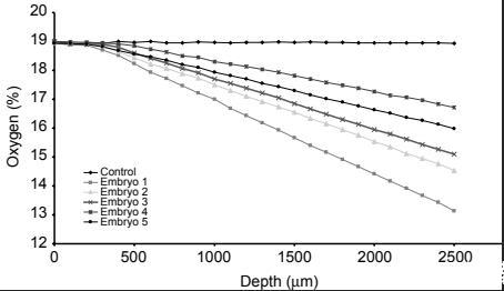 大約1小時后,通過測量毛細管中連續(xù)等距測量點的氧氣濃度確定由胚胎呼吸產(chǎn)生的氧氣濃度梯度(圖2A)。記錄通過將微傳感器尖端向下移動通過充滿培養(yǎng)基的玻璃毛細管進行,以200μm步長測量深度達2500μm的信號(圖3)。對于每一步,傳感器信號由100個數(shù)據(jù)點的平均值組成,在2秒平衡后1秒內(nèi)記錄。為了獲取下一個胚胎的氧氣濃度剖面,玫瑰座盤用手動和輕柔地旋轉(zhuǎn),使用無菌吸管將下一個毛細管定位進行分析。在每輪測量中,所有五個胚胎加上空毛細管都被測量。作為標準,進行兩輪測量,從而兩次測定每個胚胎的呼吸速率。