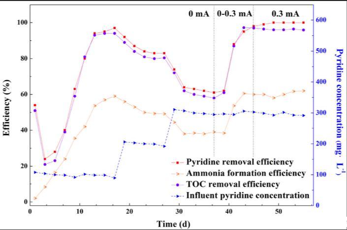 在啟動期最初37天,無電流供應下,厭氧反應器中進水濃度為100毫克/升時,吡啶去除效率在前17天末高于95%(圖1)。然而,當吡啶濃度增加至300毫克/升時,僅約60%,表明高吡啶濃度對厭氧條件下其降解有負面影響。在38天提供小于0.3毫安的小電流后,陽極電位從-244±4.5毫伏增加至-150±9.5毫伏,而陰極電位從-360±5.5毫伏降低至-800±15毫伏。有趣的是,吡啶去除和NH4-N形成效率顯著從61.1%和39.3%(37天無電流時)增加至98.3%和60.7%(55天有電流時)。純電解系統(tǒng)中吡啶去除效率僅為2.3±1.0%,表明小電流電解過程對吡啶的降解幾乎可忽略。NH4-N形成是吡啶環(huán)裂解的關鍵證據,因為先前研究表明吡啶環(huán)中的氮常在吡啶生物降解過程中轉化為NH4-N。然而,測得的NH4-N僅為吡啶中氮的60%,這可能是因為吡啶降解產生的大部分NH4-N用于生物質合成。此外,電流供應后超過95%的TOC被去除,而厭氧條件下僅約57%的TOC被去除,表明電流刺激下厭氧條件下吡啶幾乎完全礦化。先前研究表明,電化學刺激可通過提供電極作為陽極電子受體或陰極電子供體加速有機污染物的降解。例如,電化學刺激可增強洛克沙胂生物降解和礦化為無機砷,促進通過物理化學處理廢水去除砷。值得注意的是,微生物電子轉移對于電化學刺激過程中洛克沙胂降解至關重要。在本研究中,厭氧系統(tǒng)中的陽極在吡啶降解中起關鍵作用,因為吡啶抵抗微生物還原降解但更容易在陽極氧化降解中屈服。此外,在處理吡啶污染物時,電極可對微生物提供連續(xù)和精細的刺激。