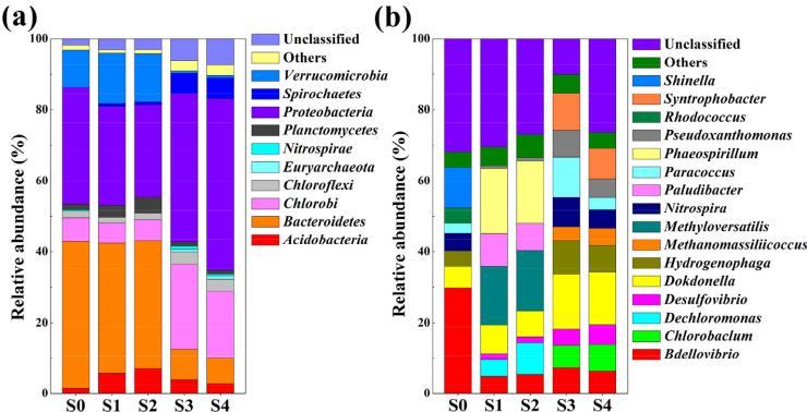 圖5. 不同階段微生物按(a)門類和(b)屬級分類分布