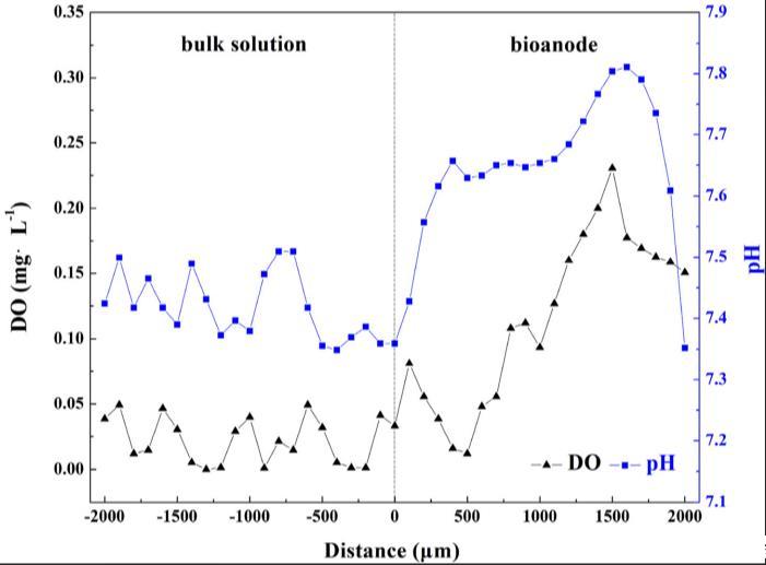 陽極在厭氧系統中的作用不僅作為替代終端電子受體,也是產氧場所,導致陽極周圍微環境變化。使用微電極測量進行生物陽極中氧濃度和pH變化測試。如圖4所示,本體溶液中氧濃度始終低于0.05毫克/升,表明反應器中嚴格厭氧條件。當生物陽極深度從0到1500微米時,氧濃度快速從0.03增加至0.23毫克/升。氧分布表明生物陽極內部,即近陽極表面,產生氧氣,在陽極區創造更缺氧條件。向陽極引入氧氣有益于頑固有機物降解。適當量的氧氣可刺激細菌生長或幫助底物利用范圍擴展。然而,應注意,當生物陽極深度從1500到2000微米時,氧濃度快速從0.23降低至0.15毫克/升。推測氧濃度下降是由于生物膜內好氧和兼性細菌代謝消耗。pH值分布趨勢與氧濃度相似。由于合成廢水中磷酸鹽緩沖液,本體溶液pH穩定在7.35-7.51。然而,pH值從生物陽極表面的7.36增加至1600微米深度處的7.81,這可能源于吡啶生物礦化過程中NH4-N釋放。當生物陽極深度達到2000微米時,pH值回到7.35,這可能源于兩個原因。首先,陽極產生氧氣時,同時產生一部分質子。其次,推測堿性氨通過生物氨去除過程被去除,導致pH降低。此過程也可能消耗生物陽極中的氧氣,假定為1500-2000微米深度氧濃度下降的另一原因。