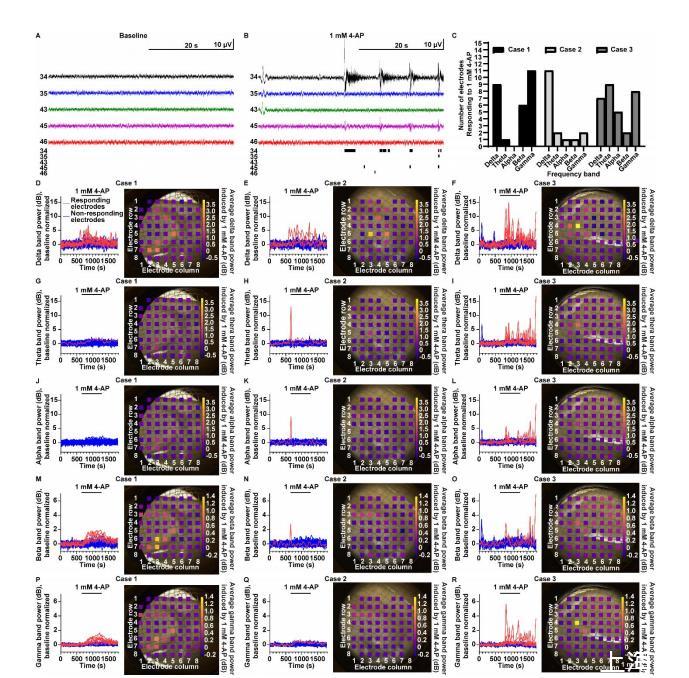 細(xì)胞外動作電位(EAP)和局部場電位(LFP)數(shù)據(jù)的分析基于先前描述的NeuroExplorer流程。簡而言之,EAPs從帶通濾波信號(300-3000 Hz,二階巴特沃斯濾波器)中檢測,當(dāng)其振幅超過噪聲標(biāo)準(zhǔn)偏差(SD)的-5.5倍時被判定為EAP。在4-AP峰值效應(yīng)期間(970秒至1270秒)的任何10秒?yún)^(qū)間內(nèi)達到活性電極標(biāo)準(zhǔn)(最少兩個EAPs,平均頻率0.05 Hz,瞬時頻率0.1 Hz)的電極被認(rèn)為顯示出真實的EAP活動。LFP數(shù)據(jù)從低通濾波信號(<200 Hz,二階巴特沃斯濾波器)中提取,分析五個頻帶:delta(δ)1-3 Hz,theta(θ)4-8 Hz,alpha(α)9-13 Hz,beta(β)14-30 Hz和gamma(γ)30-100 Hz。使用閾值法識別對LFP數(shù)據(jù)每個頻率范圍有反應(yīng)的電極。計算每個電極和頻率范圍在基線期(0秒至600秒)的功率譜密度(PSD)平均值,以此確定基線噪聲。如果在4-AP期間(670秒至1270秒)的任何10秒?yún)^(qū)間的PSD超過基線噪聲SD的5.5倍,則該電極被視為有反應(yīng)。