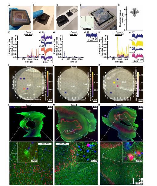 活性電極的定位(圖1 I-K)與錐體細(xì)胞層(圖1 L-N)不符,這與觀察到的錐體細(xì)胞層中NeuN陽性細(xì)胞(神經(jīng)元)的丟失以及病理學(xué)家對海馬硬化的評估一致(表1,組織病理學(xué))。相反,活性電極的位置更對應(yīng)于齒狀回的顆粒細(xì)胞層,那里有明顯的NeuN陽性神經(jīng)元(圖1I對L,J對M和K對N)。除了硬化,海馬膠質(zhì)細(xì)胞增生是TLE的典型病理特征。所有三個海馬體中對星形膠質(zhì)細(xì)胞蛋白GFAP的染色均顯示出廣泛的膠質(zhì)增生(圖1L-N),這可能導(dǎo)致切片大部分區(qū)域未顯示EAPs(圖1I-K)。活性水平也可能受到長時間恢復(fù)期的影響(見樣本運輸與制備)。總體而言,結(jié)果表明Hippo-MEA能夠識別活性和非活性區(qū)域,并能從硬化的人類海馬體切片中檢測到EAPs。