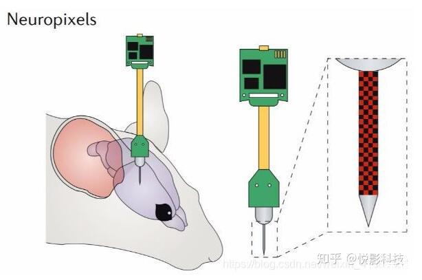 在空間分辨率方面有重大突破的當(dāng)屬Neuropixels神經(jīng)電極[2]。Neuropixels神經(jīng)電極的形狀為寬70 um,長10mm的針狀,在電極上分布有多達(dá)960個(gè)12 um*12 um的方形神經(jīng)電信號(hào)采集位點(diǎn)。研究證明,當(dāng)用兩個(gè)Neuropixels神經(jīng)電極同時(shí)植入大鼠的腦內(nèi),可以同時(shí)采集來自于5個(gè)腦區(qū)大于700個(gè)神經(jīng)元的動(dòng)作電位。