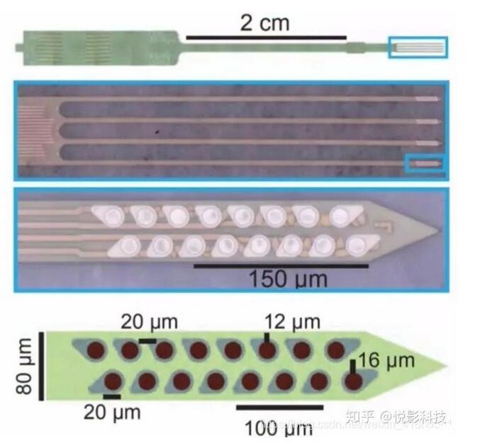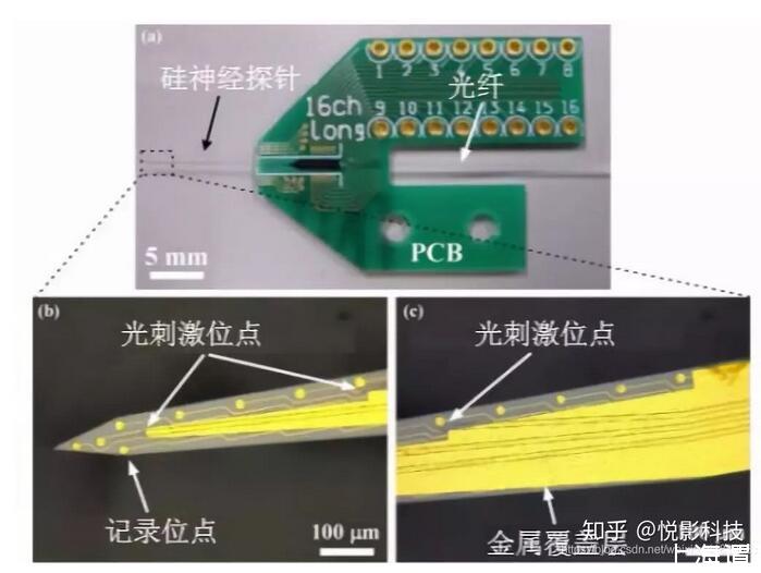 還有研究者在神經(jīng)微電極上集成LED光刺激位點(diǎn),可實(shí)現(xiàn)對神經(jīng)信號(hào)進(jìn)行光刺激的同時(shí)采集神經(jīng)電信號(hào)[6],如下圖所示。