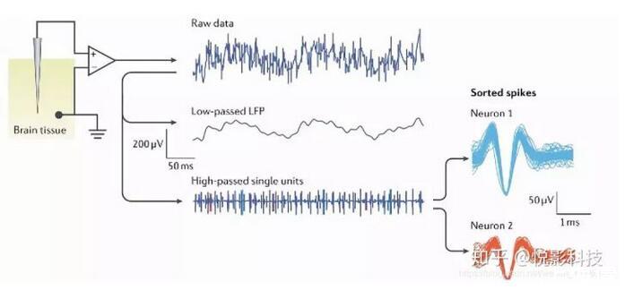 在神經(jīng)科學(xué)領(lǐng)域,研究者往往需要采集動(dòng)物腦內(nèi)的神經(jīng)電生理信號(hào),即神經(jīng)元放電產(chǎn)生的動(dòng)作電位,或神經(jīng)核團(tuán)眾多神經(jīng)元電活動(dòng)形成的局部場電位。比如說,在動(dòng)物執(zhí)行工作記憶任務(wù)時(shí)采集動(dòng)物前額葉皮層的神經(jīng)電信號(hào),以此來研究工作記憶的神經(jīng)機(jī)制。那么問題來了,如何才能采集或檢測到動(dòng)物腦內(nèi)的神經(jīng)電信號(hào)呢?這里研究者就需要借助于神經(jīng)微電極,神經(jīng)微電極采集顱內(nèi)神經(jīng)電信號(hào)的示意圖如下所示。