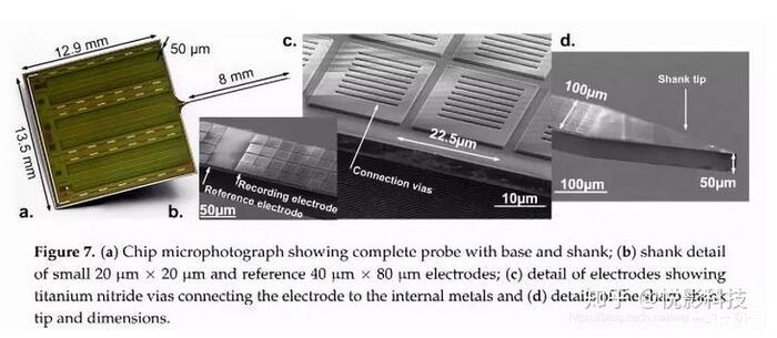 此外,由比利時(shí)魯汶大學(xué)的Bogdan團(tuán)隊(duì)研制的NeuroSeeker電極把神經(jīng)微電極的空間分辨率做到了極致[3]。NeuroSeeker電極為寬100 um,長8mm的針狀,其上分布有多達(dá)1356個(gè)神經(jīng)電信號(hào)采集位點(diǎn),可最大化地實(shí)現(xiàn)高空間分辨率的神經(jīng)電信號(hào)采集。