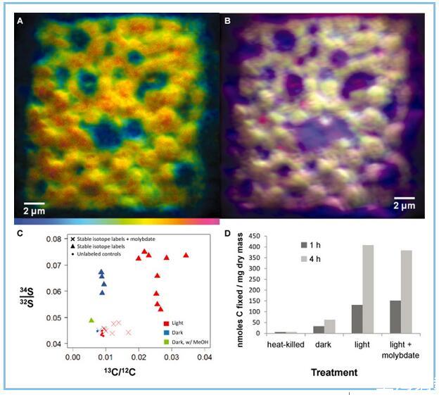 碳固定是光依賴性的,如通過nanoSIMS測量所評估的13 C摻入(圖8 C)和放射性標記(14 C)碳酸氫鹽孵育測定(圖8 D)的,表明PB-PSB1作為主要生產(chǎn)者在聚合中。鉬酸孵育不影響在短期溫育(1-4 1H)碳的光依賴性固定,表明PB-PSB1不是直接由鉬酸(圖抑制8 d)。在4天的溫育,鉬酸發(fā)現(xiàn)以降低聚集體碳固定在光,這表明較長的持續(xù)時間的治療鉬酸強加限制硫化物,從而降低PB-PSB1的初級生產(chǎn)力(圖8 C)。