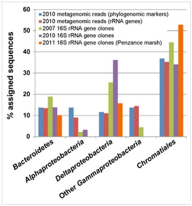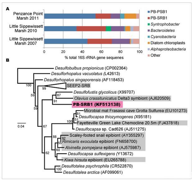 A.16S rRNA基因序列從粉紅色漿果中分離出來,這些漿果采集于2011年(89克?。┡碣澦菇钦訚?,2010年(94克?。┖?007年(90克?。㎜ittle Sippewissett沼澤。兩個操作分類單元(OTU),紫硫細菌(PB-PSB1)和硫酸鹽還原菌(PB-SRB1),占觀察到的序列的60%以上。