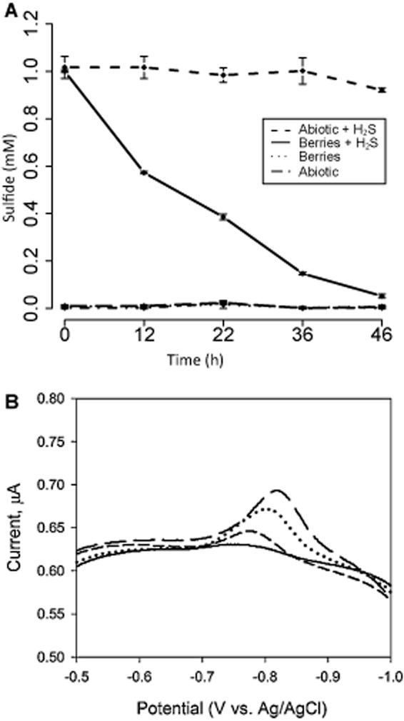 A.在50毫升過濾消毒的沼澤水中用50個小漿果進行微觀孵化時,通過Cline測定法測量硫化物濃度。孵育保持在14小時光照、10小時黑暗循環(huán)中。在漿果存在下的孵育過程中消耗了添加至1 mM濃度的硫化物(實線),而非生物對照顯示沒有變化(虛線)。沒有添加硫化物的微觀世界從接近0 mM的初始硫化物濃度沒有可檢測到的變化。誤差棒顯示三個生物重復(fù)孵化的標準偏差。