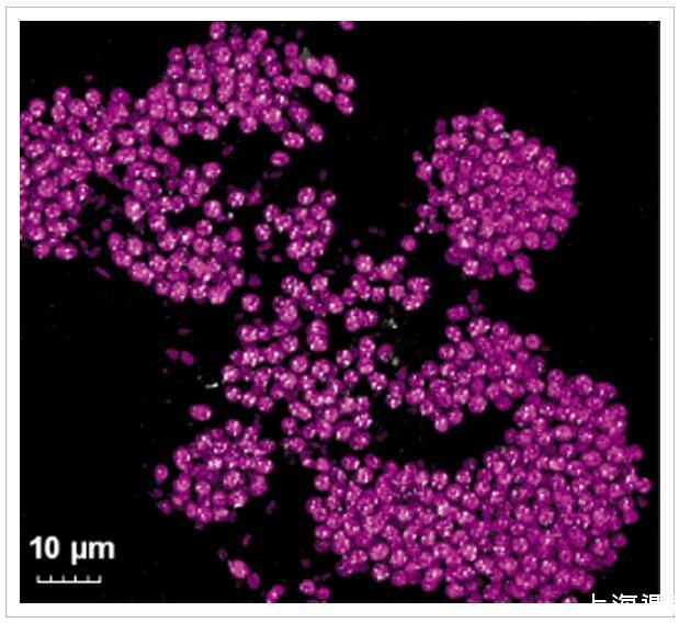 切片粉紅色漿果組織的表面反射共聚焦顯微鏡。紫色硫細菌的自發(fā)熒光(激發(fā)543 nm,發(fā)射550–570 nm)以粉紅色顯示,來自可折射元素硫包裹體的反射信號以白色顯示。