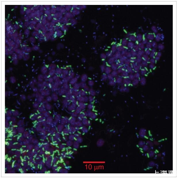 使用系統(tǒng)發(fā)育特異性探針通過催化報告基因沉積-熒光原位雜交(CARD-FISH)鑒定漿果相關(guān)的PB-SRB1物種。掃描共聚焦顯微照片顯示了來自聚集體外圍附近的粉紅色漿果生物量的橫截面。該圖像是三個熒光信號的疊加:自發(fā)熒光紫硫細菌(以粉紅色顯示,激發(fā)543 nm,發(fā)射550–570 nm),來自SRB-PiBe213探針的CARD-FISH信號(以綠色顯示,Alexa 488酪胺)和DAPI核酸染色劑(以藍色顯示)。