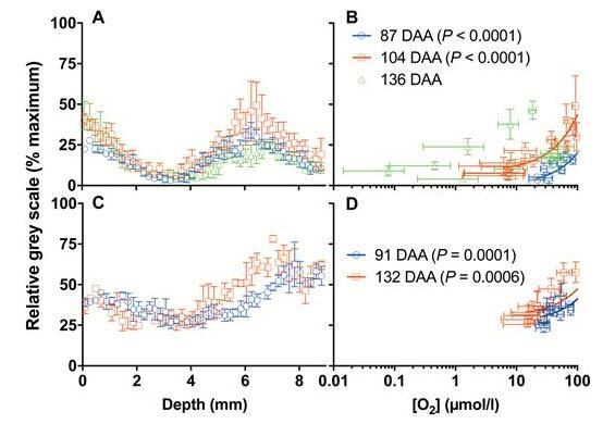 活組織熒光信號(hào)與[O2]分布之間的相關(guān)性。來(lái)自霞多麗(A)和Ruby Seedless(C)赤道半徑上的FDA染色(高值=較高的活組織)的熒光信號(hào)[相對(duì)灰度(%最大值)]。87和104 DAA上的霞多麗(B)和91和132 DAA(D)上的Ruby Seedless中相應(yīng)深度(對(duì)數(shù)刻度)的熒光信號(hào)強(qiáng)度和[O2]之間的相關(guān)性(戴明回歸)([O2]分布如圖2所示)。1)。數(shù)據(jù)是平均值±SE,n=3。