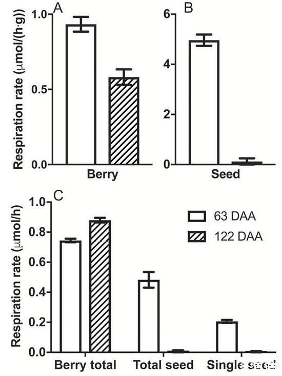 考慮到CD和[O之間的聯(lián)系2](圖3),以及發(fā)育良好的Ruby Seedless漿果中缺乏CD(圖2D),我們研究了種子對(duì)霞多麗漿果呼吸需求的貢獻(xiàn).種子鮮重在糖分積累和皮膚著色開始時(shí)達(dá)到峰值,此階段稱為veraison(Ristic和Iland,2005年多麗達(dá)),這里的霞到~63 DAA。按每克鮮重計(jì)算,此階段的種子呼吸比整個(gè)漿果的呼吸高5倍。與63 DAA相比,122 DAA的漿果呼吸減少了約三分之一(圖5A);然而,種子呼吸減少了40倍(圖5B)。漿果質(zhì)量幾乎翻了一番,從63 DAA時(shí)的7.2±0.5 g到122 DAA時(shí)的13.9±1.4 g;因此,在每個(gè)漿果的基礎(chǔ)上,呼吸速率從63 DAA增加到122 DAA,增加了約18%(圖5C)。漿果中種子總數(shù)的貢獻(xiàn)占veraison漿果呼吸需求的一半以上。這在122 DAA時(shí)下降到一個(gè)微不足道的比例(圖5C)。